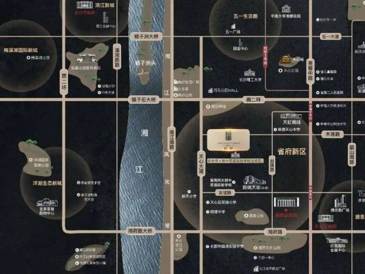 交通:坐享芙蓉中路、天心大道、南二环、湘府路等城市轴线,距离地铁1号线铁道学院站直线约2公里,全维交通速达全城。距地铁1号线铁道学院站2公里. 教育:项目配建九年一贯制学校(规划). 片区内天心区实验小学、湖南师大附中双语实验学校、明德中学、明德天心中学等环伺。 公园:项目配置置润府式线性&六大口袋主题公园(在建),坐享湘江生态带、天心滨江公园、南郊公园、海棠公园、湘府文化化公园、铁路文化公园等,构建“一江五园”优渥生态资源。 商业:项目配置都市自建商业街区(在建)、天虹商场、新新姚天街(在建)、永辉等簇拥,坐享商业繁华。