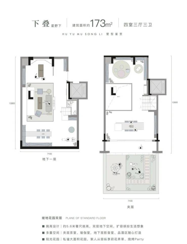 可以非常明显的看出,项目是做了双首层的概念。因为特殊的坡地处理,所以有天然的地理高差,地下层与一层自然贯通,形成两个首层,使原有“地下层”跃然平面之上,成为稀有的“阳光院落层”。