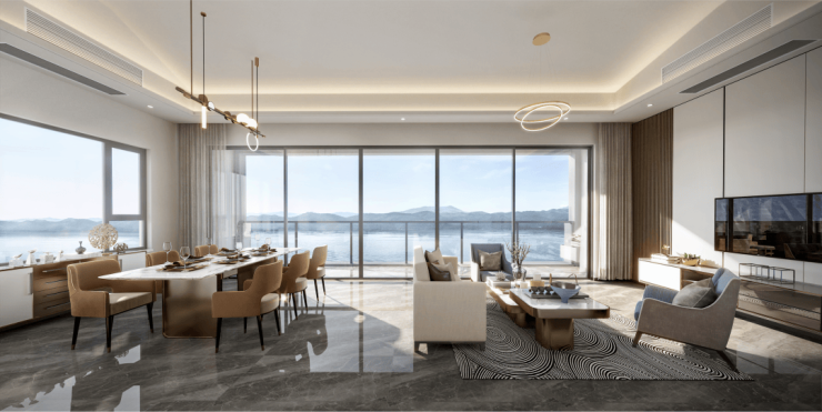 约270°环幕视野:餐客厅采用大横厅设计,同时横亘眼前的约7.1米双联阳台+大面积边窗,让家人无论就餐、品茶、休憩,抬眼即是无边风景,心胸激荡万千;