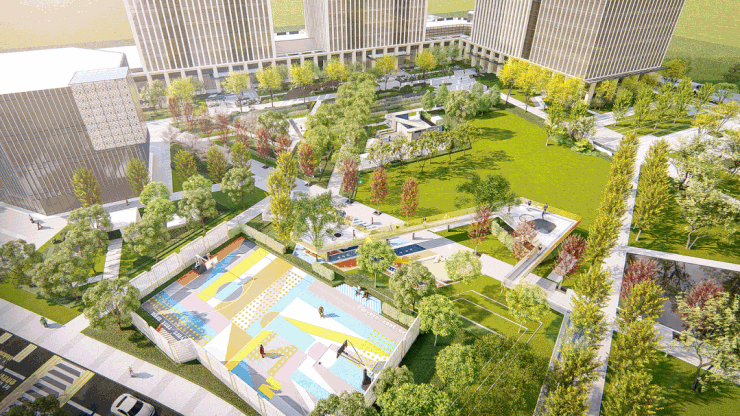 全区涵盖了各样功能空间,包含社交艺术广场、极限运动体验、户外健身、篮球场、儿童游戏空间等。三大轴线也配置了不同主题的景观树种,起到标志性的自然引导及季相话题的創造,而中央景观桥承担了趣味的流线安排,并激活了横向及束向空间。贴合了社交、自然、艺术、运动、爱好的有机生活模式。