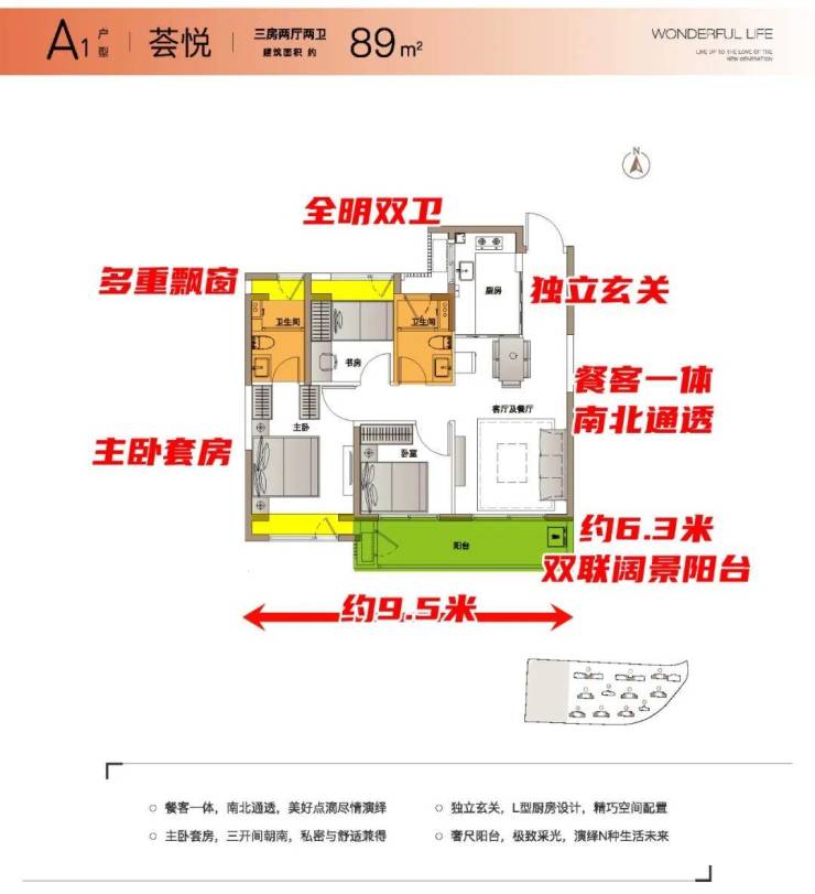 主力户型为建面约89㎡三房两厅两卫