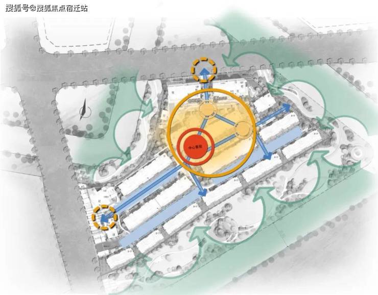 项目总体布局体现为“一环、两轴、三围合”的设计构思。一环”是指连接小区主次入口的主环道以及形成小区中央的大花园,“两轴”是指贯穿小区东西和南北两条相交的主要景观轴线,“三围合”是指小区南侧有50米城市绿化带,东侧和北侧均有20米城市绿化带,三面均被景观绿化带和东侧的长山直河、南侧的官河,北侧的郎家浜河所环绕,自然景观俱佳。