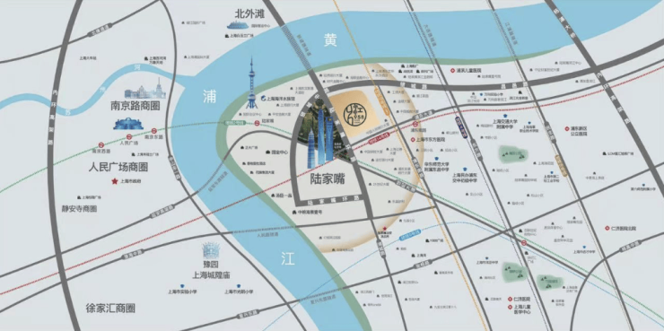 陆家嘴,地处上海市区中部,位于上海市浦东新区的黄浦江畔,两面环水,其中,西面隔江与外滩万国建筑博览群相望,北面隔江眺望北外滩,占地面积31.78平方千米。陆家嘴是上海国际金融中心的核心功能区,为多家跨国银行的中国(含港澳台)及东亚总部所在地。陆家嘴境内有东方明珠广播电视塔、上海中心大厦、上海环球金融中心、上海金茂大厦等现代化建筑楼群,江边是老码头遗址。
