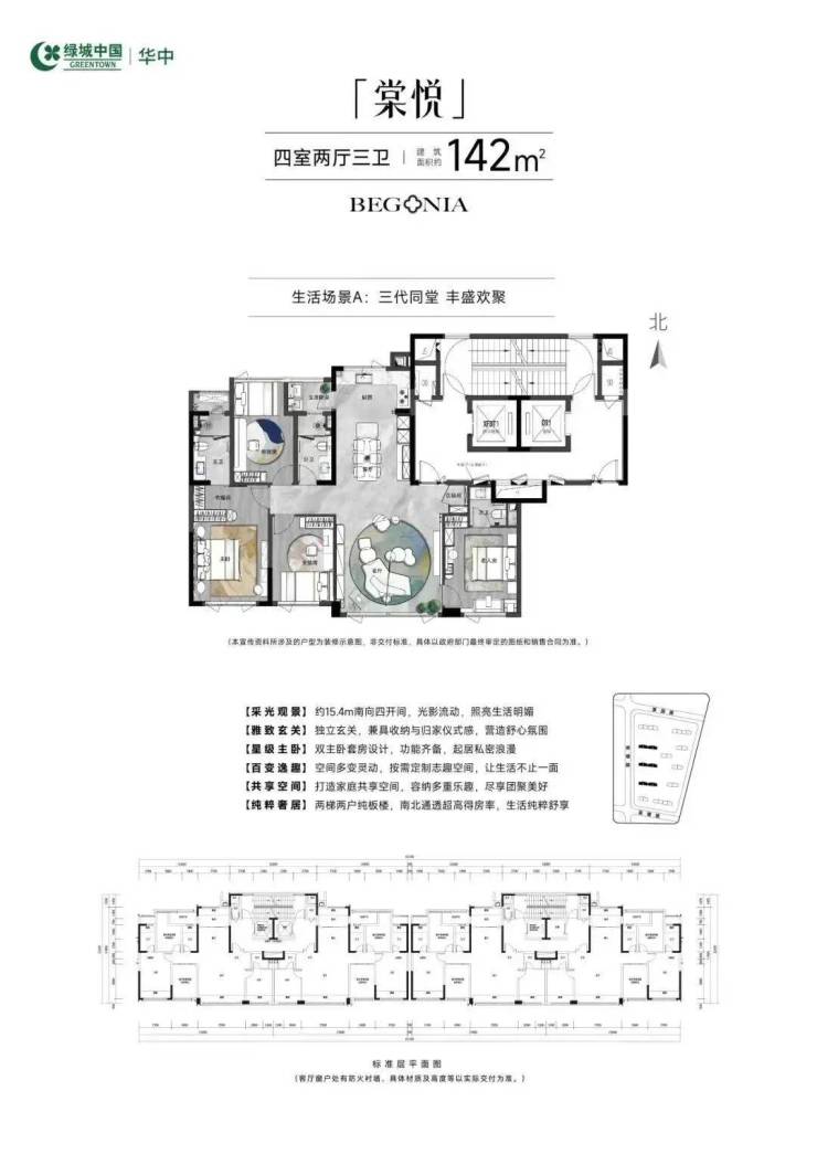 【户型臻造】142平方米经典户型,以其15.4米的阔绰面宽、四开间全南向布局、双套房设计,以及灵活多变的居住空间,成为同类产品中的稀缺佳作。即便市场上有类似产品,也很难同时集齐这些优势。此外,在不计入电梯厅面积的情况下,实际得房率高达约97%,彰显出卓越的空间利用与居住价值。