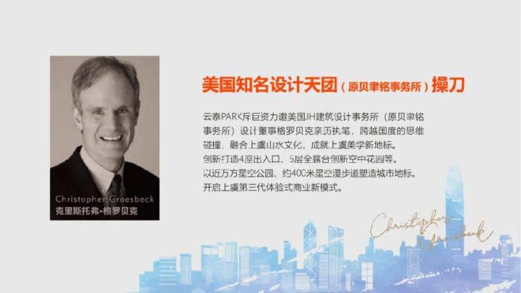 云泰PARK花重金请来了美国JH设计(原贝聿(yu)铭事务所),贝聿铭是一个地道的江苏省美籍华人,这是一家国际顶级的设计单位,美国的罗斯福大学、香港中银大厦、苏州的博物馆等大型国标性建筑物都出自他们手笔。我们项目在他们手笔的定位是长三角商业综合体地标性建筑,同时我们申报了”REARD全球设计大奖“、“OPAL伦敦杰出建筑大奖”等两项国际大奖其中一个奖项一定会获得。是象征着标志性的身份,买了我们的商铺那么同时也象征了您的身份!