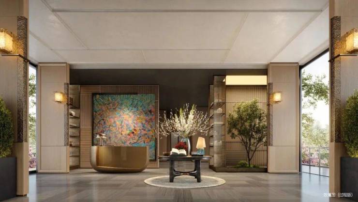 社区大堂极具仪式感,未来会采用地下会所设计,入口采用三重弧形石材墙体+圆角幻彩穿孔顶,夜幕下如流淌的鎏金河流。