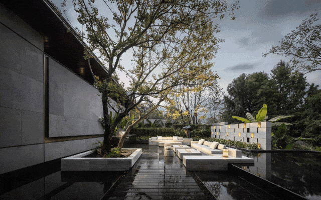 综合体的独特张力通过酒店塔楼立面上标志性的巨型玻璃天幕彰显,并勾勒出内外部庭院的轮廓。环形天幕进一步构成有顶中央走道,既加速空气流通,又在不影响采光的同时遮挡风雨。因此,天幕之下形成了一个全天候的微环境,鼓励住户和游客在室外公共空间举办活动、互动和放松。