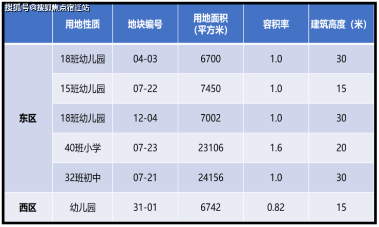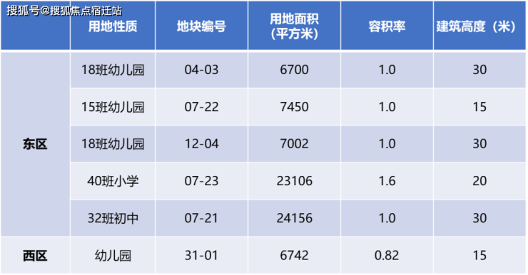 东区和西区最大的不同在于教育和公建设施配套,东区人口更密集,有5幅教育用地,从幼儿园至初中;而西区仅有1幅教育用地,作为幼儿园。