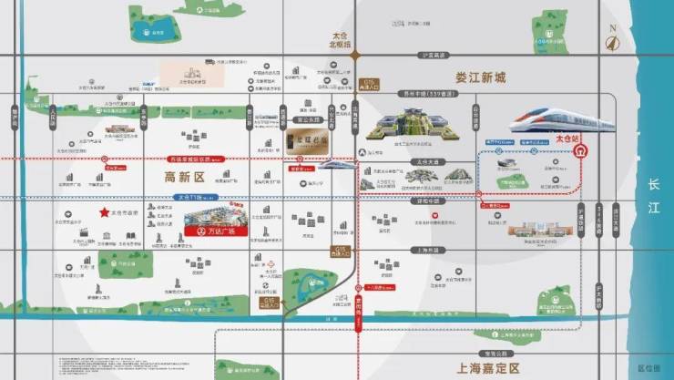 【多维交通】沪太同城一小时,太仓T1线(规划中)、嘉闵线(规划中), 苏锡常城际铁路(规划中)——其中苏锡常城际铁路板桥站(规划中)位于项目南侧, “三纵四横”城市主干道毗邻G15沈海高速、S48沪宜高速及沪宜公路,距太仓新区高速入口直线距离约1.4公里。