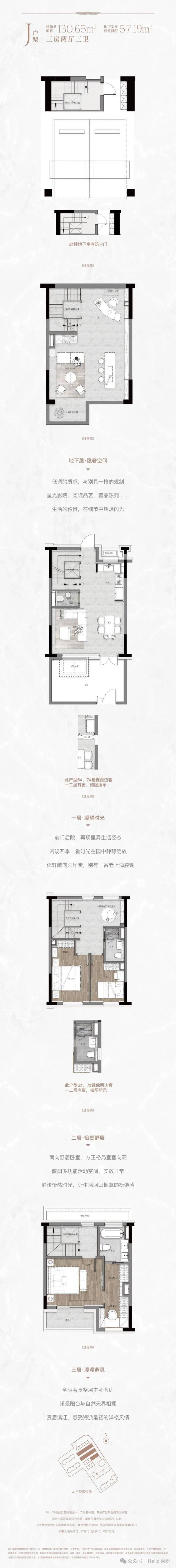 華望·J户型·建筑面积约130.65㎡,地下室建筑面积约57.19㎡