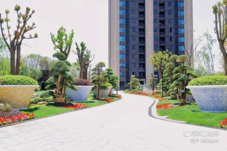 社区外部沿街绿化景观,由多重花坛组成,搭配大小灌木和香樟等多种树木。社区内部植被丰富,设置众多