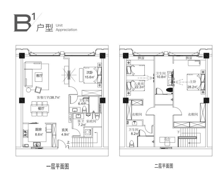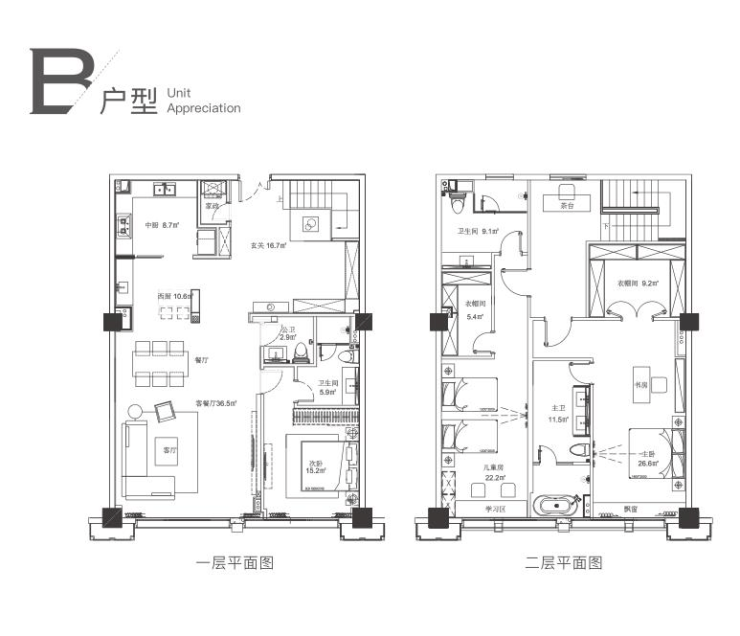 B户型:客餐厅一体,主卧带书房,中西厨,大衣帽间