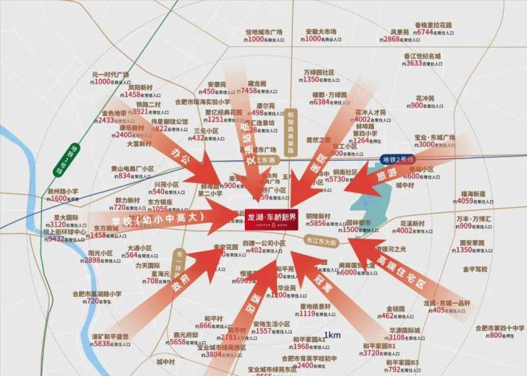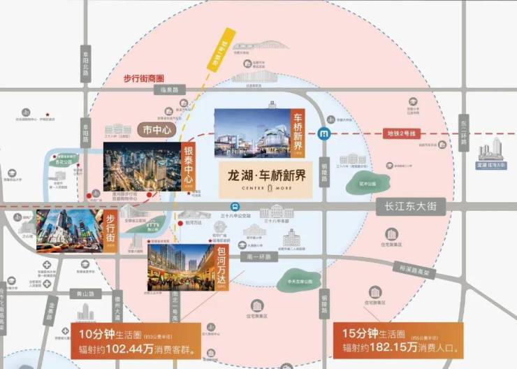 百万人口红利 同频百亿商圈——占位瑶海百万级人口区域核芯,人口密度全市TOP3长江东路板块,二环内常住人口约185万+,2KM内约15万+人口。与淮河路步行街、银泰中心、包河万达共享年均5500万高净值消费人群。