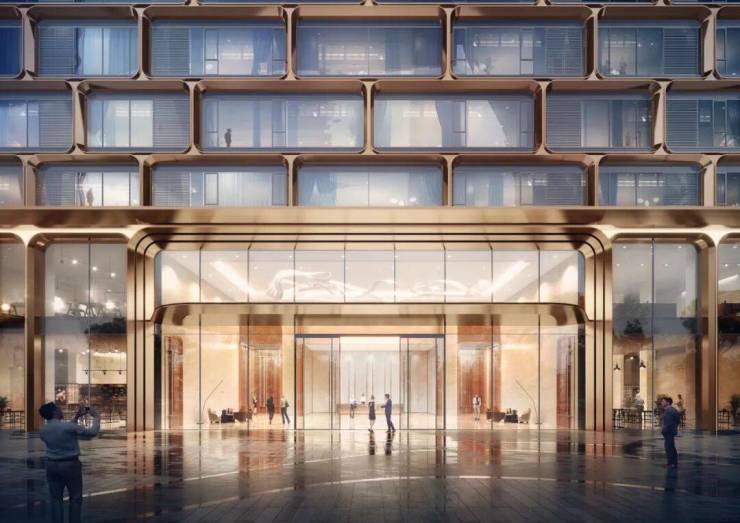 设计提取钱塘江水“潮涌”的动态元素,抽象为独特精美的金色铝板曲面线条,结合大面积的玻璃,勾勒建筑体量的层间关系,交织出极富韵律的纵向线条,以潮水般流动变化的独特气质屹立江岸,又融入钱塘潮水流淌奔涌的历史之中。
