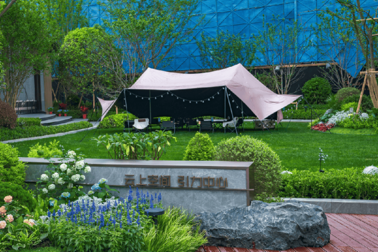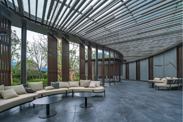廊架下方,一处半围合的会客空间若隐若现,后期在这里或品茗、或插花、或对弈、或社交......一厅、一水、意境深远,整体的空间氛围大气且优雅。会客厅前方是近350㎡的中央阳光草坪的云上空间,为业主提供多功能户外活动场地,聚引生活的引力,绽放社区的活力。