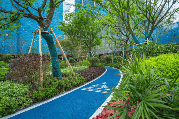 环绕在阳光草坪周围的彩色跑道,是串联全社区功能区的健身步道,总长约400米,按距离划分为热身区、起跑区和加油区,让业主可以悠然绽放运动的乐趣。