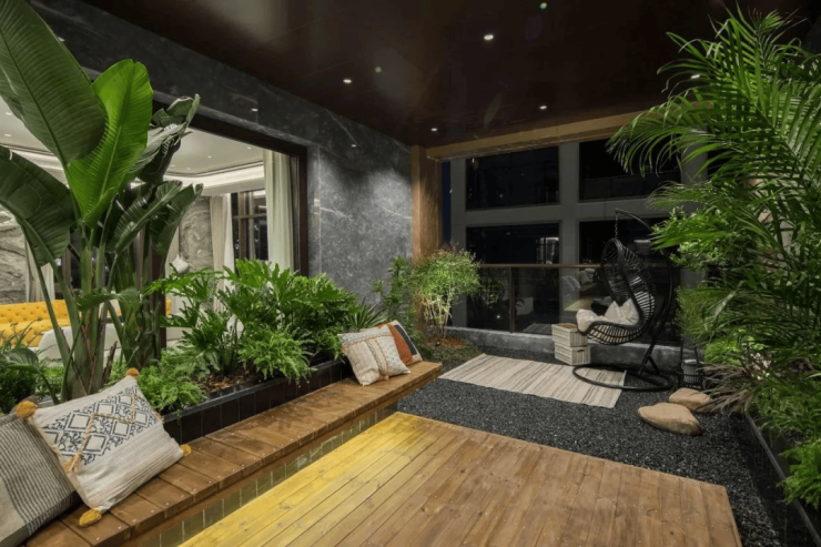 更别说更早的阳光海岸、银杏汇、水晶澜轩了,大多只有普通阳台。约40㎡的露台,尺度几乎和下叠院子相近。
