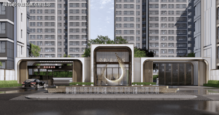 小区入口以水印光年为主题,透光金属板和光年艺术雕塑映照在仿黑金砂大理石涌泉水景中,体现星光为引,仪式归家。