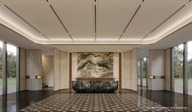 在您踏入这个尊贵而温馨的社区,首先映入眼帘的是迎宾大堂。这里充满了奢华、舒适和雅致的氛围,每一处细节都透露出不凡的品味和精致的生活态度。迎宾大堂中,一个蓝翡翠接待台熠熠生辉,它矗立在海纳百川七彩奢石背景墙前,仿佛在诉说着一种不朽的价值。这种历久弥新的奢石,见证了光与美的相得益彰,是品质与格调的完美结合。地面上的闪电米黄和布鲁诺灰的石材拼花,优雅而浪漫,仿佛在引领着一种潮尚生活的新风尚。