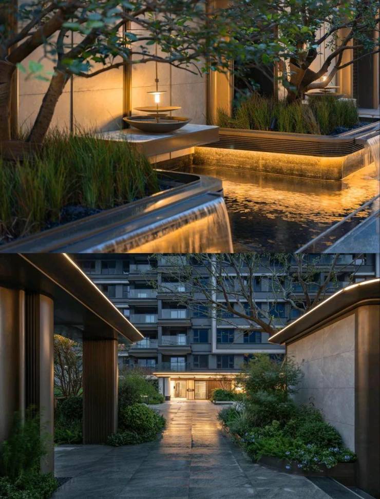 走进度假式园林,这里的自然景观让人心旷神怡。一踏入社区,六颗甄选的香橼树便迎面而来,带来了浓浓的自然度假风。远处的瀑布跌水勾勒出一幅流淌的森屿美景,仿佛置身于一幅壮丽的画卷中。浅米色的仿石材景墙与大堂入口遥相呼应,营造出一种和谐而统一的美感。
