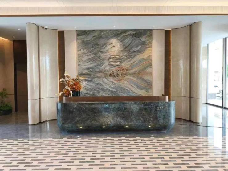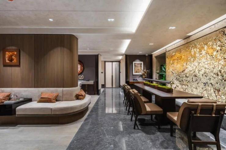 入户大堂,更会感受到一种别样的尊贵体验。顶部仿石材艺术玻璃以其独特的纹理和质感,犒赏着每一位归家的业主。蓝金沙岩板则平添了一份奢华与神秘的美感,让人仿佛置身于一个充满魔力的空间中。而大面积的镜湖春晓岩板,以其淡雅内敛的光泽,带来了一种非同一般的尊贵感。