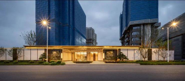 主入口以低调奢华的原材料,展现出闻名门第的酒店风格。精致的迎宾水景、苍劲有力的罗汉松,以及蓝翡翠般的奢石,为城市天际线增添一份神秘与奢华。独特的异形仿铜星空顶设计,巧妙搭配香槟金色斜角造型铝板和闪耀灯光,诠释了艺术美学的完美碰撞。