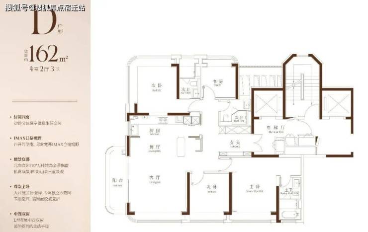 建面约162㎡4房2厅3卫可以封神!客厅和边卧各自做出两个完整的采光面,是常规户型的200%!人在家中坐,门外的自然美景直接就从这270°的奢阔观景视野透进来。