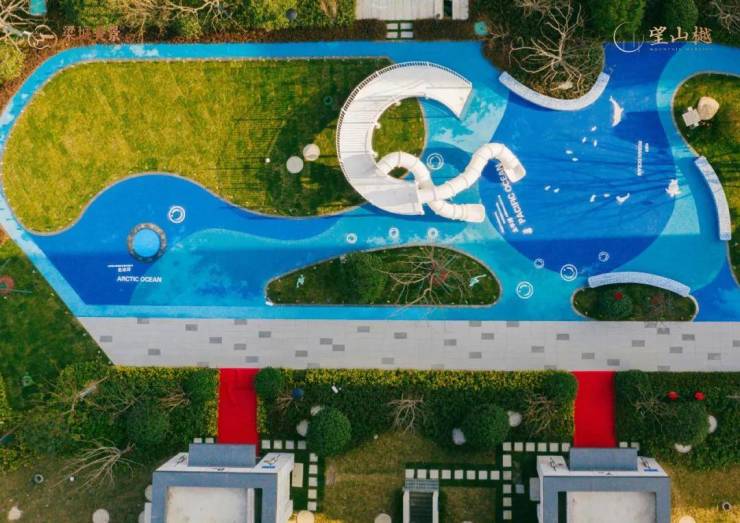 以水元素为蓝本,提取水之行韵,同时引入山丘的形态元素和层峦叠错的构成,经艺术提炼解构重组,既有开敞的草坪也有层次丰富的组团,精心筑造景观园林空间。