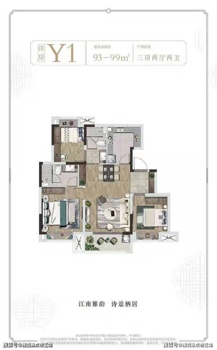 首先介绍一下小三房,面积段约91~99㎡,主要分布在5、9、13、17~20#(15#二单元),户型为三室两厅两卫,得房率78%。总开间约10.3米,进深约10.7米,客厅开间约3.8米,公共活动区域(客厅+餐厅+入户)约30㎡。