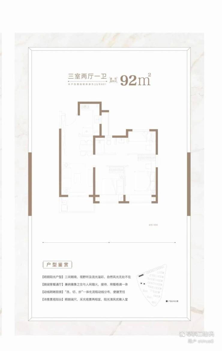 您好,接下来由我来带您参观我们92户型,3房2厅1卫户型,户型整体方正实用,面积控制合理,整个房型三开间朝南,客厅主卧次卧都能充分沐浴阳光,全明户型,餐客一体的设计理念,让整个下厨操作的动线更显合理。L型的厨房岛台更为彰显空间感,户型内置一卫,干湿分离,朝南两间卧室均赠送飘窗,可用作主卧,老人房或儿童房,朝北卧室可用作书房或功能房的灵动空间,精准控制总价段,青年购房者上车的首选户型。次卫也是干湿分离设计,让早上洗漱更加灵活。