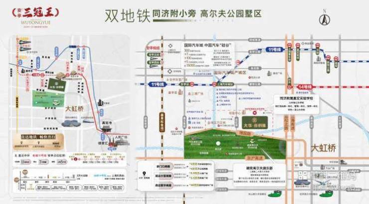 公共交通:距离地铁11号线上海汽车城站约2.5公里,此线贯通上海南北,10站至上海西站,更直达徐家汇商圈、前滩商圈、迪士尼乐园,无需换乘。此外项目距离14号线西延伸线(已规划)仅约1.5公里,此线路由嘉定至浦东,横跨五个区,途经静安寺、新天地、陆家嘴等核心商圈和地标。轨交嘉闵线也已开工,预计2027完工,后续15个站点串联起嘉定、大虹桥、闵行。