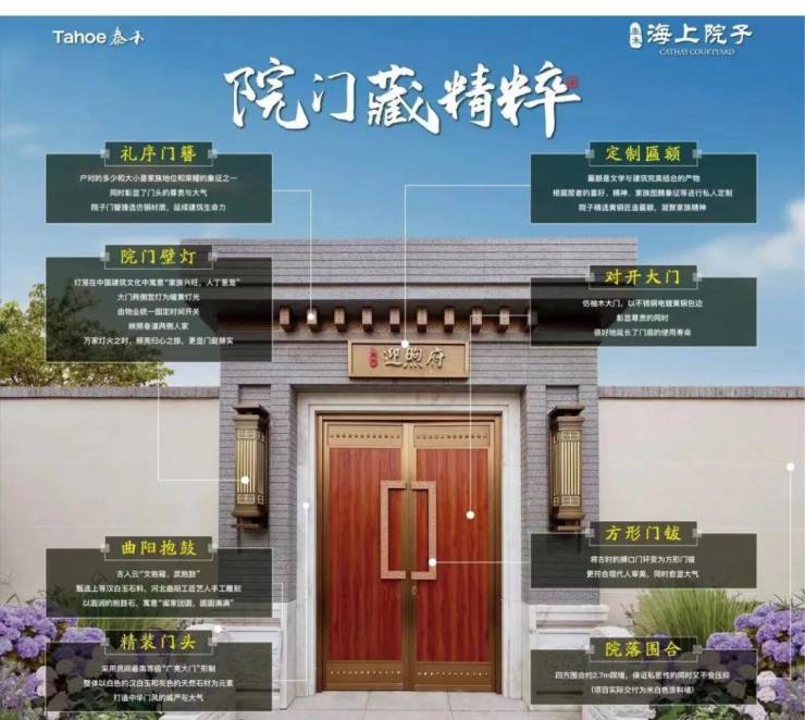 第二,海上院子门头体系采用古代大宅门专有的“三重进制“,院门、坊门、宅门,层层入户,体现尊贵的社区气势及归家仪式。社区门头采用汉白玉、纯黄铜、花岗岩等名贵材质匠心打造,三门之上配有壁灯、匾额、浮雕、抱鼓石等元素,构筑厚重的中式文化。同时还有多种元素申请了国家十大专利,等下具体给您展开讲解。