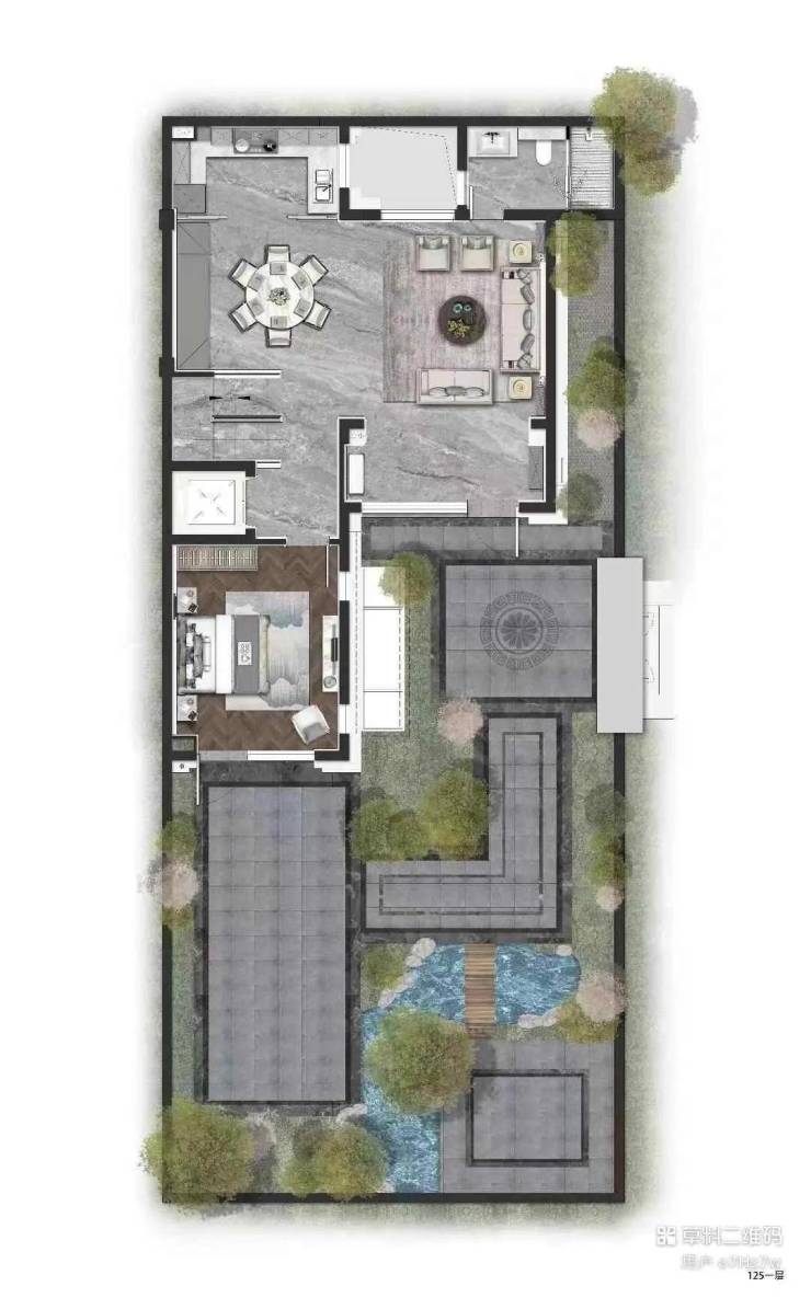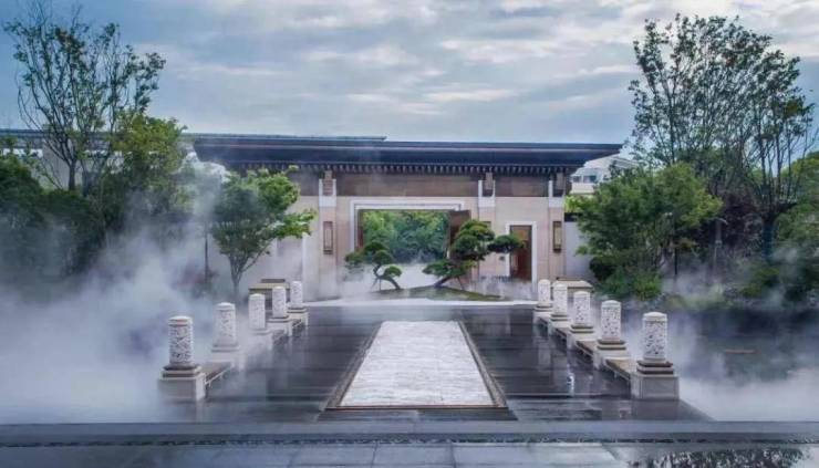 走进大门是我们的前院景观,四方水院,这个是徽派建筑的主要特征之一、寓意四水归堂,有聚水聚财聚福气,四方财运滚滚来之意。中间我们采用泰山石和五针松,首先有一种一眼不能窥其径的设计意境,这种方式在景观学上叫做古简障景。设计师精挑细选五针松,又名迎客松。迎八方客,恭候业主归家,既庄严也不失温馨。山石结合草木是中式园林中最常用的造景方式,通过一步一景,移步换景的手法展现中式园林山重水复疑无路,柳暗花明又一村之感。
