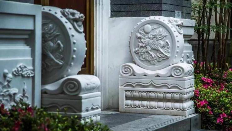 接下来我们踏上的就是我们的三步台阶,为什么是三级?《道德经》有言:“道生一,一生二,二生三,三生万物。”我们修三级台阶是祝福我们的业主“万事顺遂”。 石阶两侧是一对汉白玉石狮,汉白玉是中式建筑景观的传统用材,在古代也是身份的象征。石狮造型由河北曲阳汉白玉雕刻世家纯手工雕刻而成,曲阳汉白玉雕刻技艺已于2016年被列为非物质文化遗产,非常难得,所以这个雕刻世家目前也仅服务于两个单位,一个是为我们泰禾打造院子系别墅,另一个是北京故宫古汉白玉的修缮工作。此对石狮又名北京狮,因为中国人一直有阴阳相生之说,因此石狮也有雄雌之分,雄狮脚踏昆仑球,寓意镇宅定乾坤,为业主守家护宅,雌狮脚戏幼狮,寓意业主子孙后代绵延不尽。