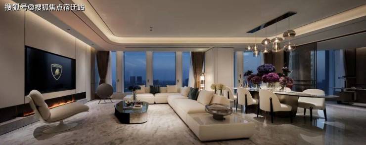 由 SWSGroup(建筑)+CCD(室内) 联袂设计,以兰博基尼超跑“楔形流体美学”为灵感,打造约230-420㎡大平层。客厅采用 13米弧形巨幕玻璃,复刻超跑流线型空间。