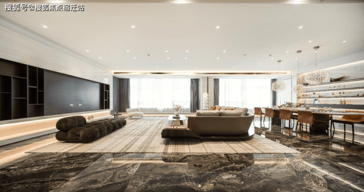 百年罗汉松 造价千万石材 约11米挑高大堂让想象力不再受限:大堂挑高约11米,仅石材用料价值千万,地面采用名贵进口石材劳伦黑金,成就身份与地位的彰显。顶部汲取德国世博馆设计灵感,通过材质分隔,演绎力量感与艺术气息。恢弘气势与毫厘细节,可按需定制全场景美学,