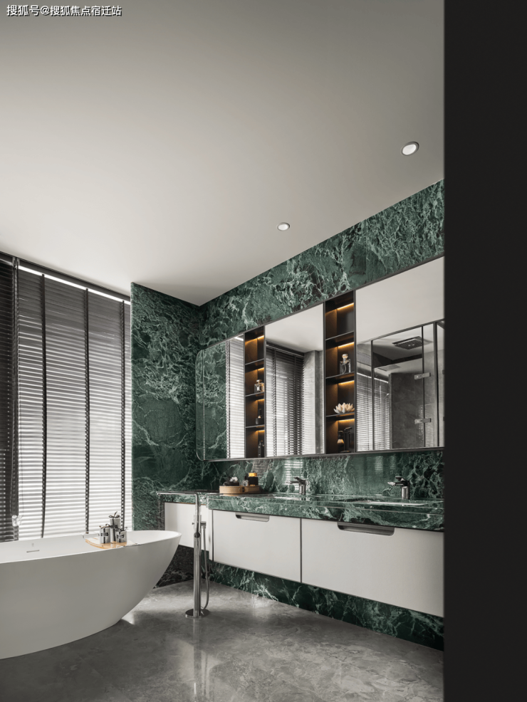 沿着木纹而生的大理石干泡台蜿蜒出灵动的曲线,流觞曲水的风雅被迎进室内。银壶盛满至洁的秉性,独立的衣帽间、化妆台,卸下铅尘繁杂,转头可见圆融如“不系舟”的浴缸,百叶窗保护隐私又不影响欣赏美景,让温热的芬芳包裹自己,享受全身心地放松,爱自己是要终身修习的浪漫。
