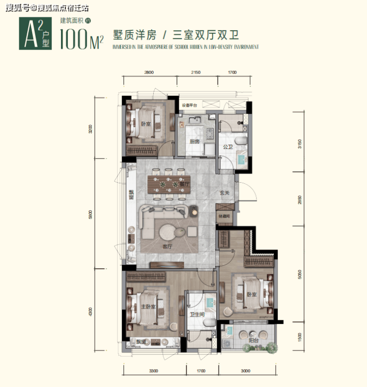 A2户型的优点大开间客厅,衔接观景飘窗,通透明亮,主卧尊享独立明卫,南向飘窗采光充足,南向次卧链接外阳台,窗外美景一览无余,时尚三房空间,彰显高性能舒居价值。
