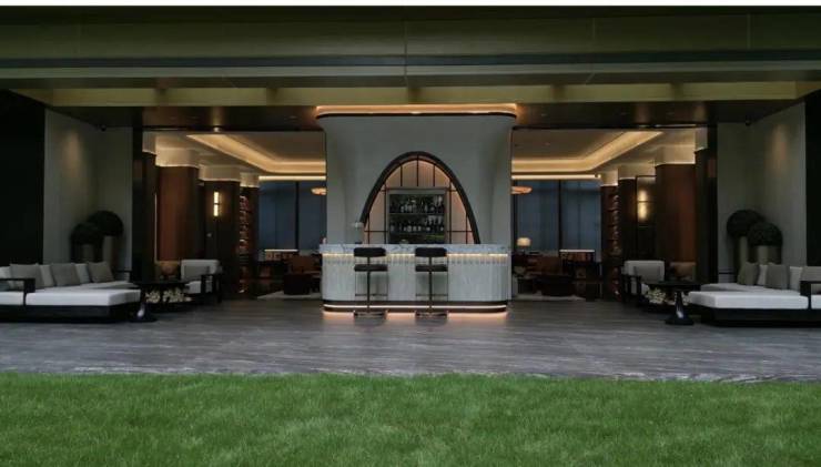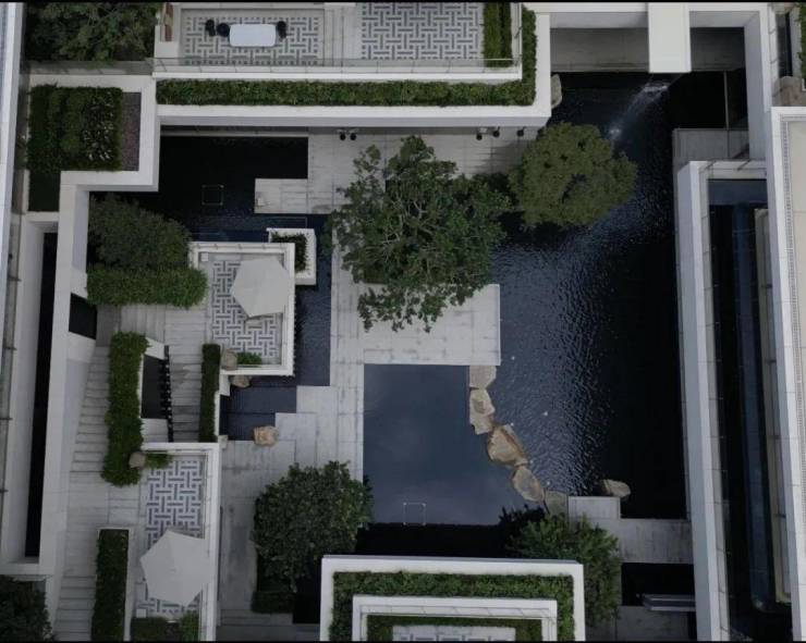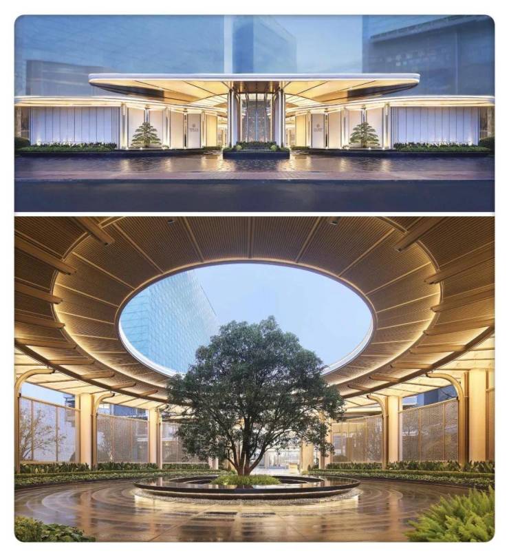2⃣、大门 为”三重归家礼序“近60米超长景墙,辅以三重檐建筑,搭配20余米维纳灰石材景墙,迎宾罗汉松苍劲挺立于安哥拉黑光面水景之上。前院则采用‘藻井天幕’暗合天圆地方的东方宇宙观,藻井落中‘百年古桂’贵气迎门,海纳百川。