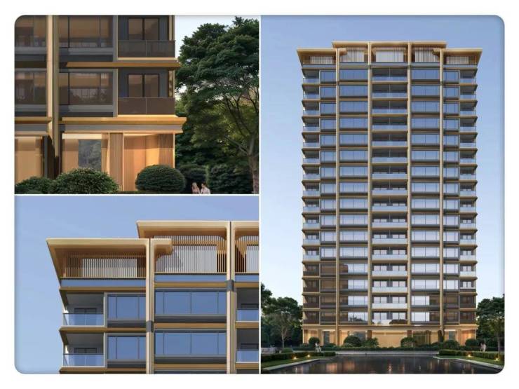 1⃣、外立面 为四面铝板+部分石材。铝板镶嵌金色金属线条,温暖色调打破冰冷灰系,斜角披檐设计承袭智慧,彰显绿城中式底蕴。