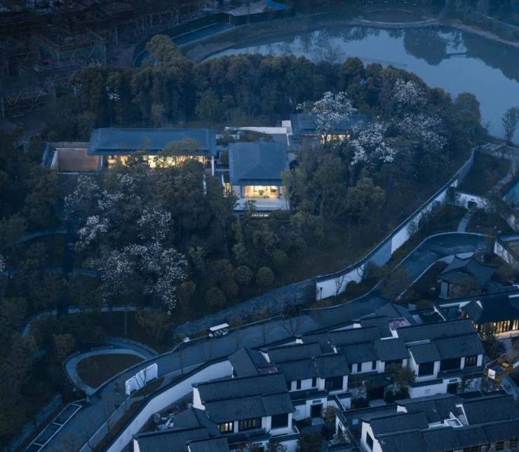 义乌桃花源位于一片隐秘的林中,拥有丰富的景观资源,是一个高端住宅集群。基地有山、有湖、有阳光,具有中国传统生活理想的元素。项目的核心主题是探讨如何将土地、景观、城市和人的关系总结为适合现代人的生活空间,并在自然景观中构建传统与现代的巧妙融合。