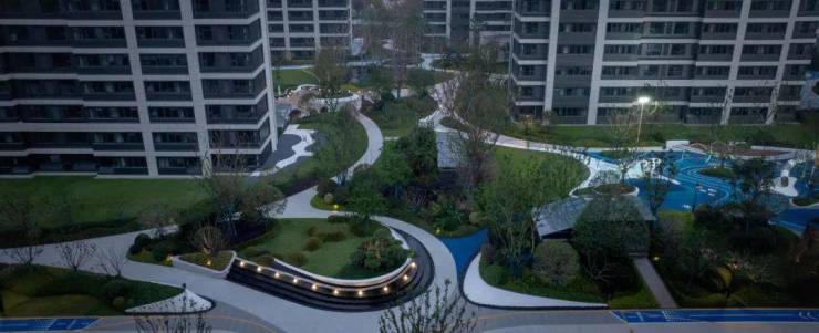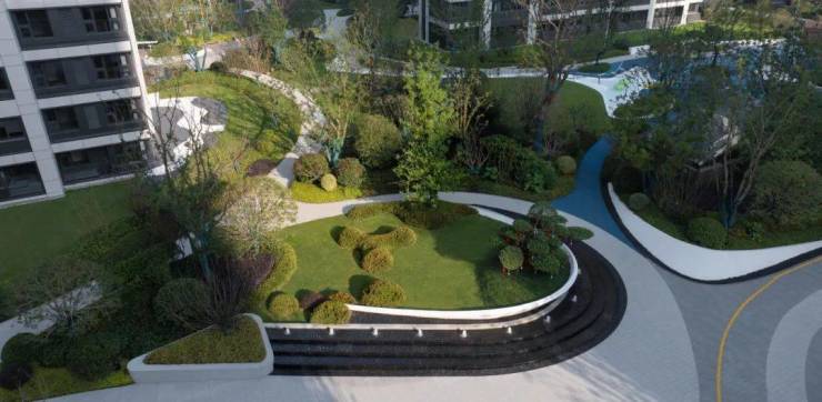 轴线作为空间的主脉络,串联起不同功能区域,形成清晰的空间秩序;而曲线型水景则以其柔美的形态,打破轴线的规整感,赋予空间灵动与活力。对景水景的设计以自然曲线为灵感,模拟溪流、湖泊的形态,营造出“步移景异”的视觉效果。水景绿岛点缀以绿植,形成人与自然的互动空间。