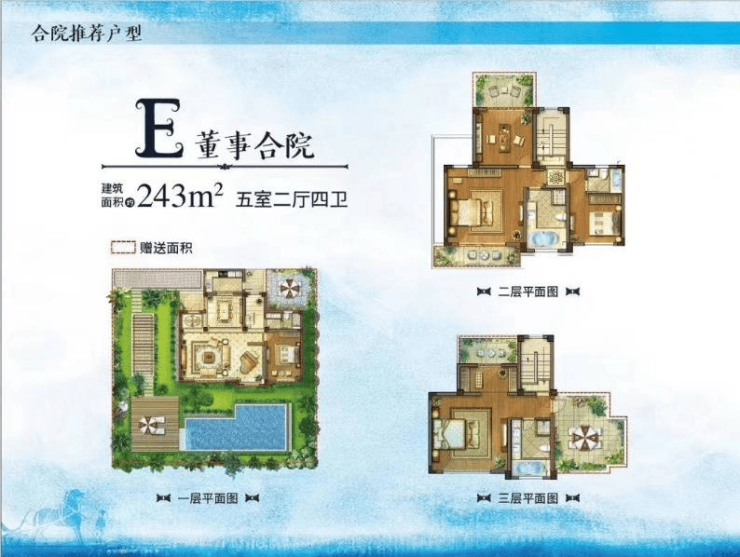 董事合院则结合中国传统合院理念,以2套双拼+3套联排别墅的组合提供四代同堂多重户型选择。