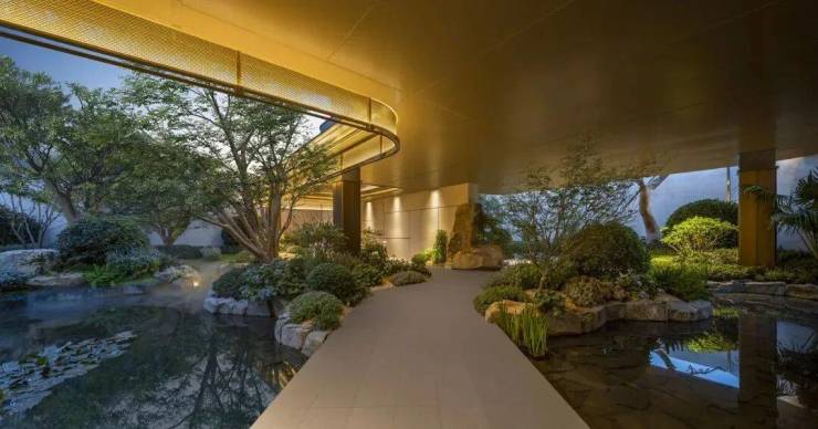 景观以「四境四巷」铺陈东方礼序,「五重归家」轴线串联宽约128米恢弘门庭、约15米叠石飞瀑、约13米榫卯转译的现代穹顶等。约1300㎡下沉式庭院采用三层立体观景设计,15米叠石飞瀑再现《溪山行旅图》的山水意境。