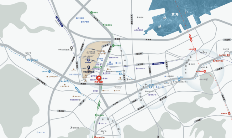 ☑通达交通:疏港路、黄河路链接中山,西南路、西安路为南北联系的主要通道