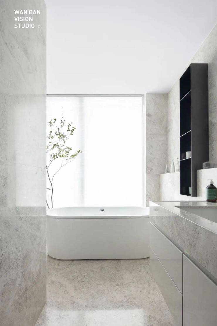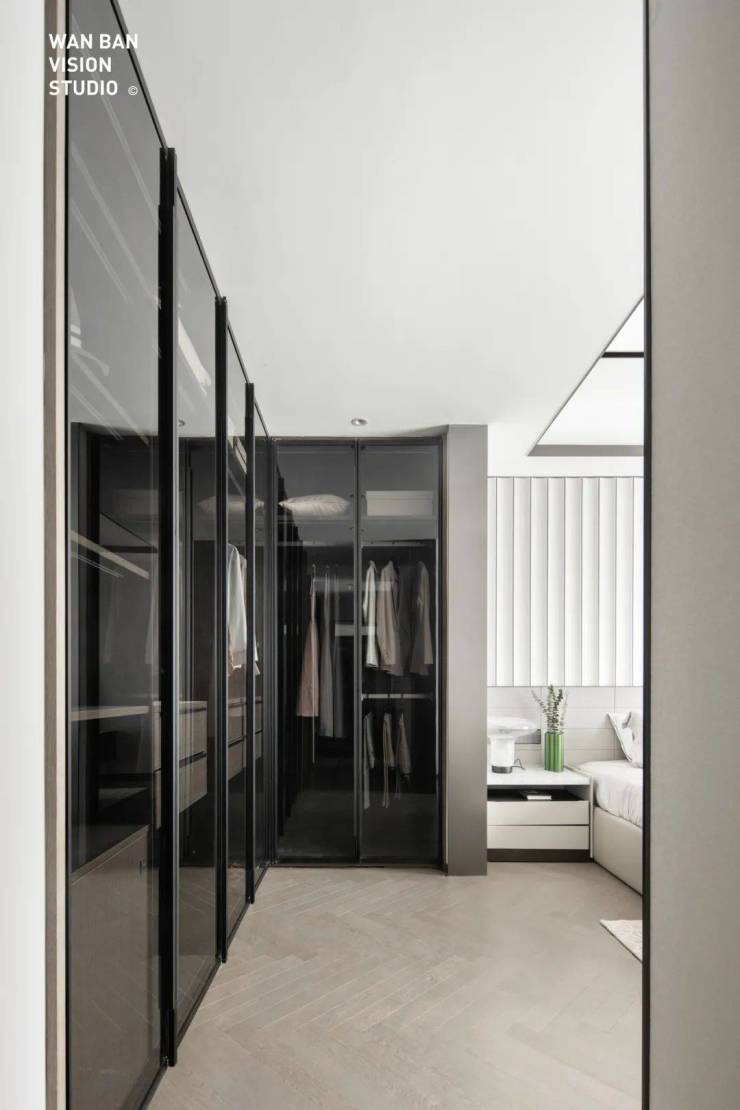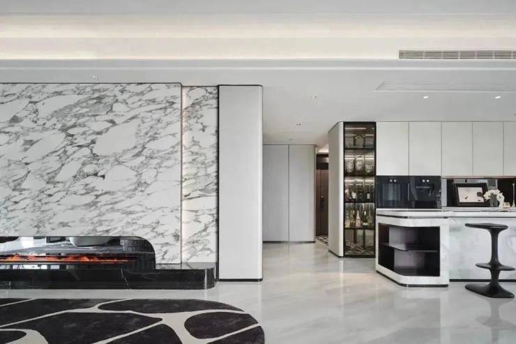 与横向面宽相对照的,是其约14.5米的纵向竖厅,厨房+吧台+餐厅+客厅+阳台逐一串连,充分扩张公共区域的尺度,形成良好的回游动线与家人互动空间。其次是空间上的打开。