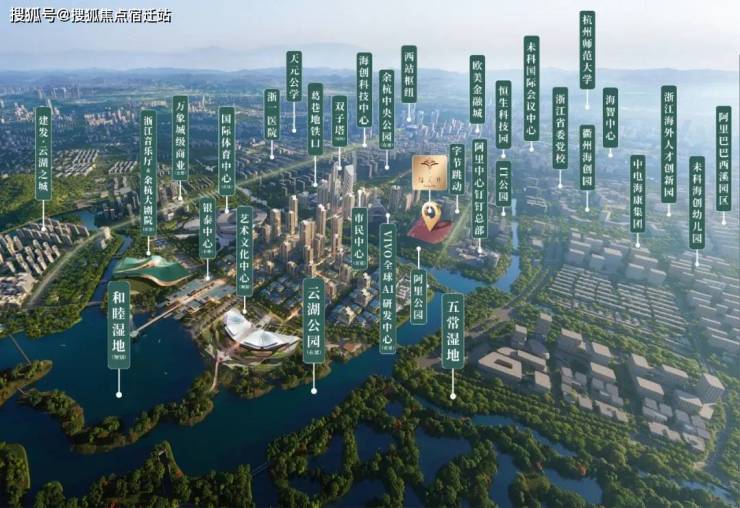 |万亩湿地:项目三面环水,南接阿里公园,直线距离约500米五常湿地及余杭中央公园(在建)环绕,坐拥超万亩湖岛水链体系,构筑半岛水岸奢宅。