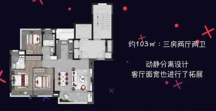 103平的3房2卫户型,增加一个卫生间,同时客厅面宽也进行了拓展。