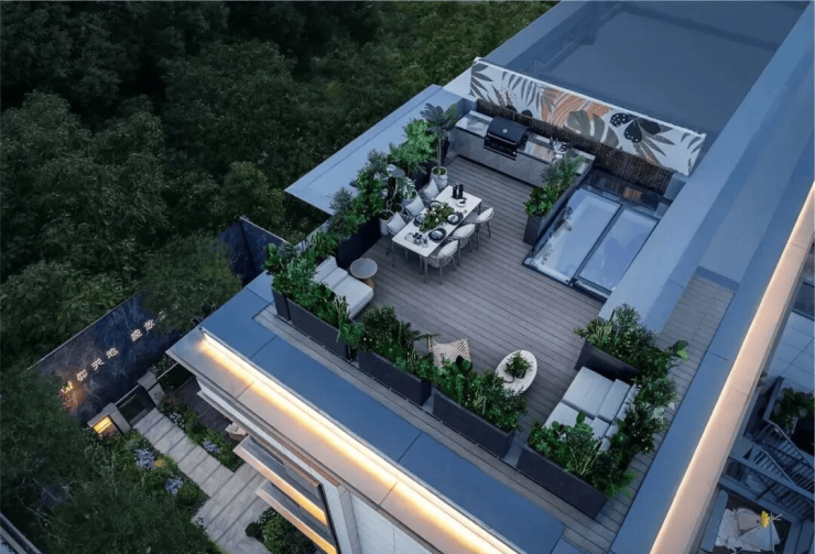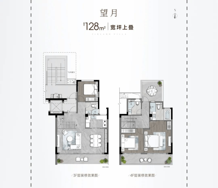 建面约128㎡上叠,3房3卫,带屋顶大露台。