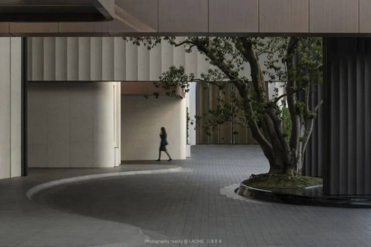 四海跋涉,寻遍珍稀,翻山越岭只为求得能够抵御岁月洗礼的百龄老树。这颗历经 54750个日升月落,150 道周密年轮的九干丛生铁冬青,穿越百年的风雨来到这里,被 9 米高的门厅华盖典藏其中。当车行至环岛落客区,院中有水,水中有树,逾越时间的生命力量在此相映相生,凝固为整个前厅大堂的精神内核